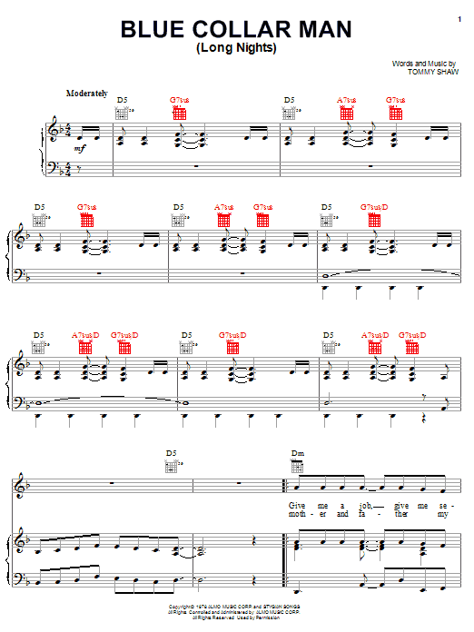 Download or print Styx Blue Collar Man (Long Nights) sheet music, chords and digital score arranged for Guitar Tab. This Pop score includes 9 page(s).