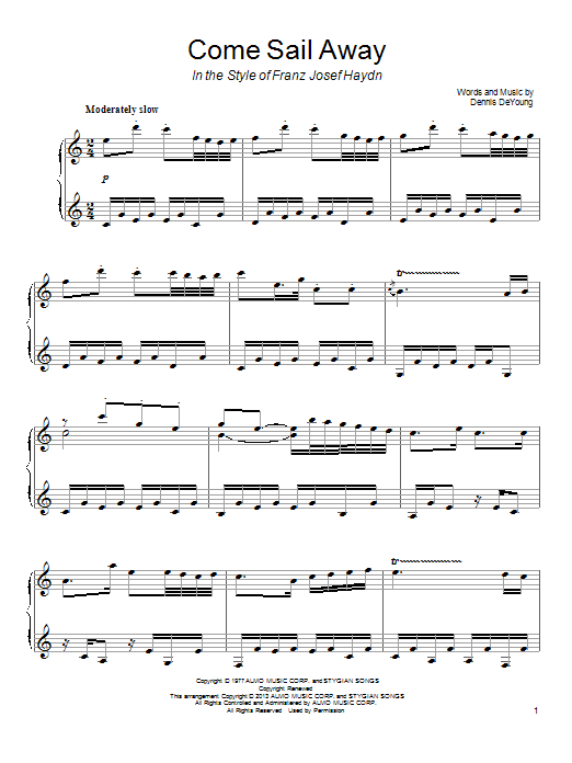 Download or print Styx Come Sail Away (from Franz Josef Haydn) sheet music, chords and digital score arranged for Piano Solo. This Classical score includes 7 page(s).