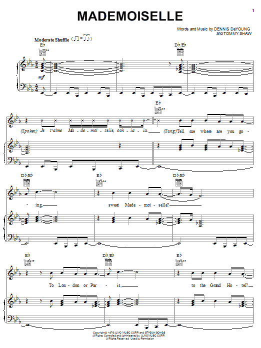 Download or print Styx Mademoiselle sheet music, chords and digital score arranged for Piano, Vocal & Guitar Chords (Right-Hand Melody). This Rock score includes 4 page(s).