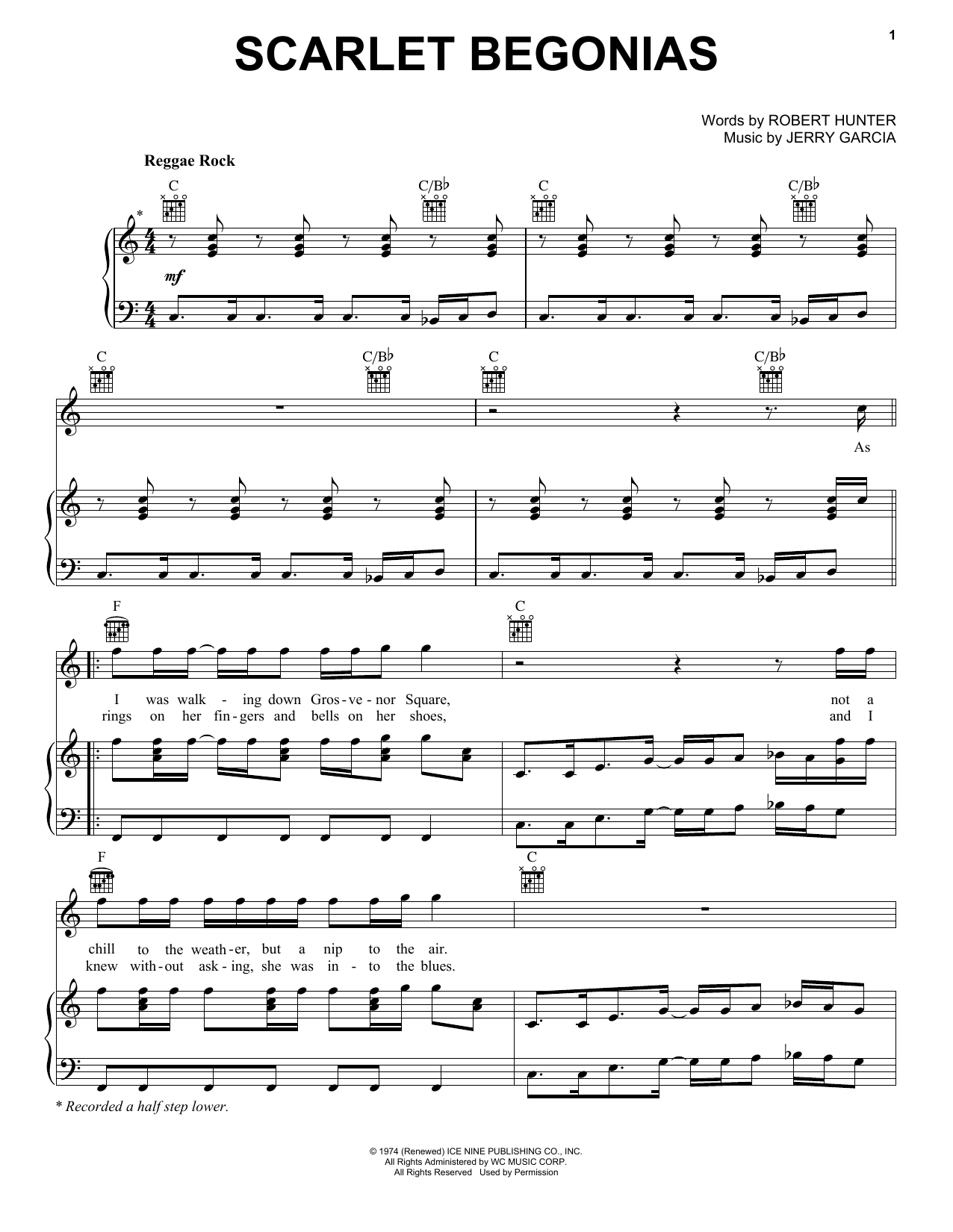 Download or print Sublime Scarlet Begonias sheet music, chords and digital score arranged for Piano, Vocal & Guitar Chords (Right-Hand Melody). This Rock score includes 7 page(s).
