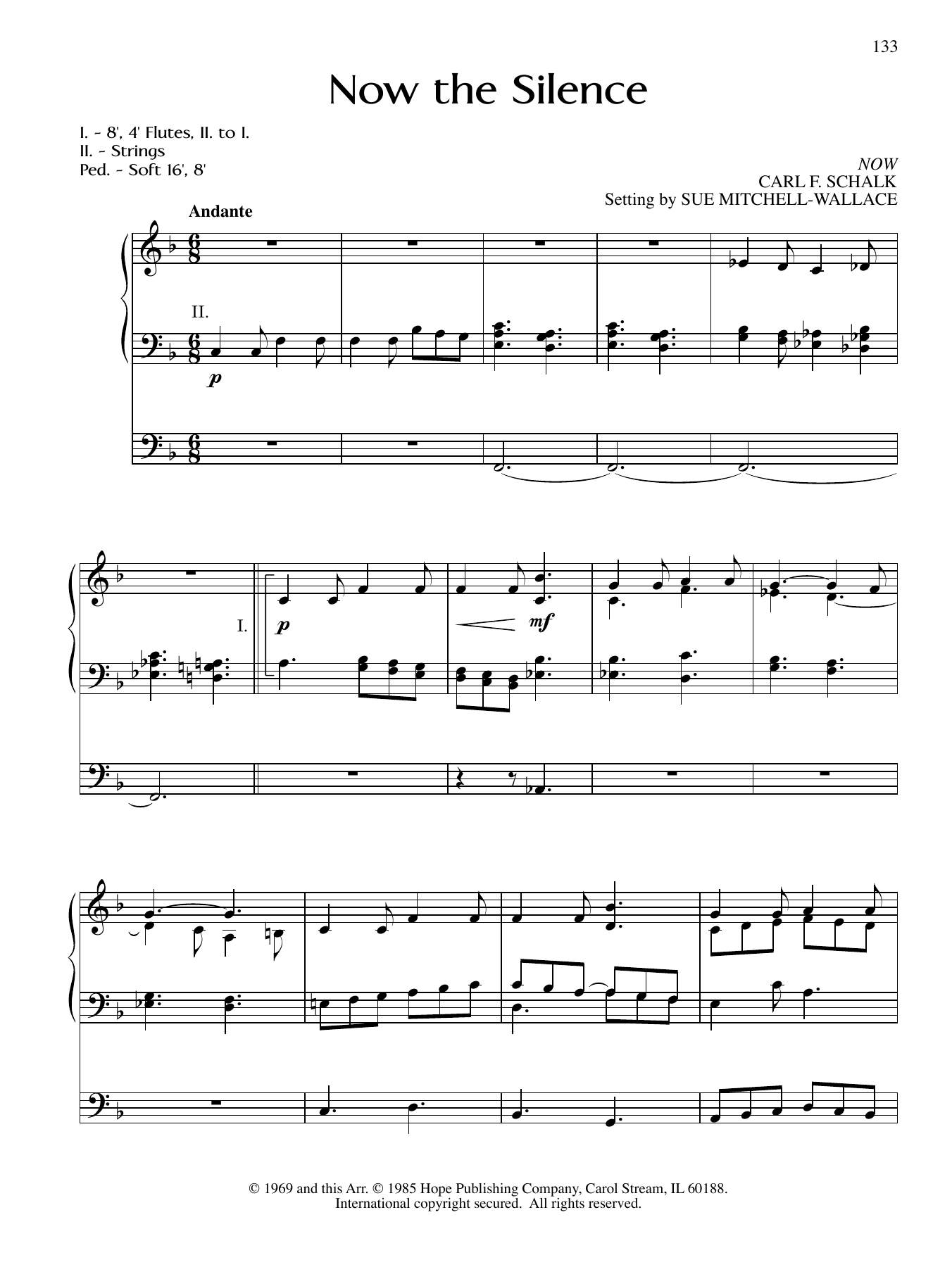 Download or print Sue Mitchell-Wallace Now the Silence sheet music, chords and digital score arranged for Organ. This Hymn score includes 3 page(s).