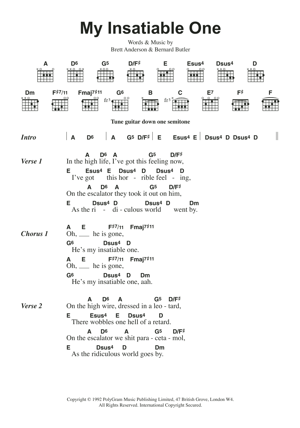 Download or print Suede My Insatiable One sheet music, chords and digital score arranged for Guitar Chords/Lyrics. This Rock score includes 2 page(s).