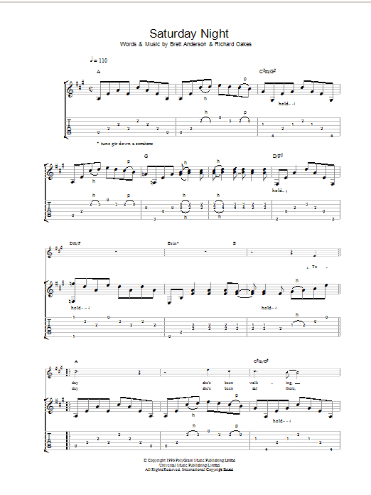 Download or print Suede Saturday Night sheet music, chords and digital score arranged for Guitar Tab. This Pop score includes 5 page(s).