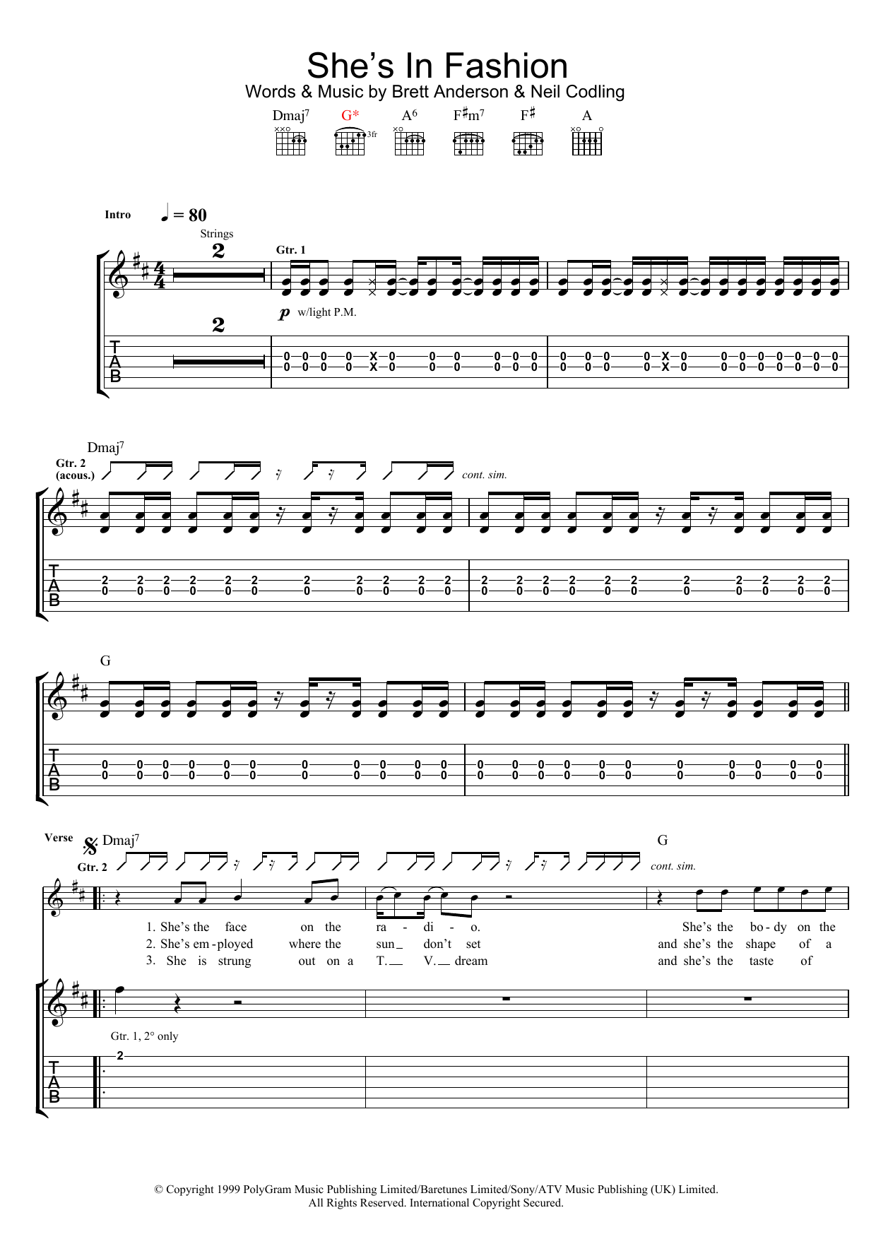 Download or print Suede She's In Fashion sheet music, chords and digital score arranged for Guitar Chords/Lyrics. This Rock score includes 2 page(s).