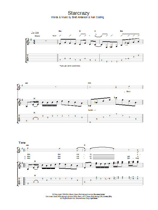 Download or print Suede Starcrazy sheet music, chords and digital score arranged for Guitar Tab. This Pop score includes 6 page(s).
