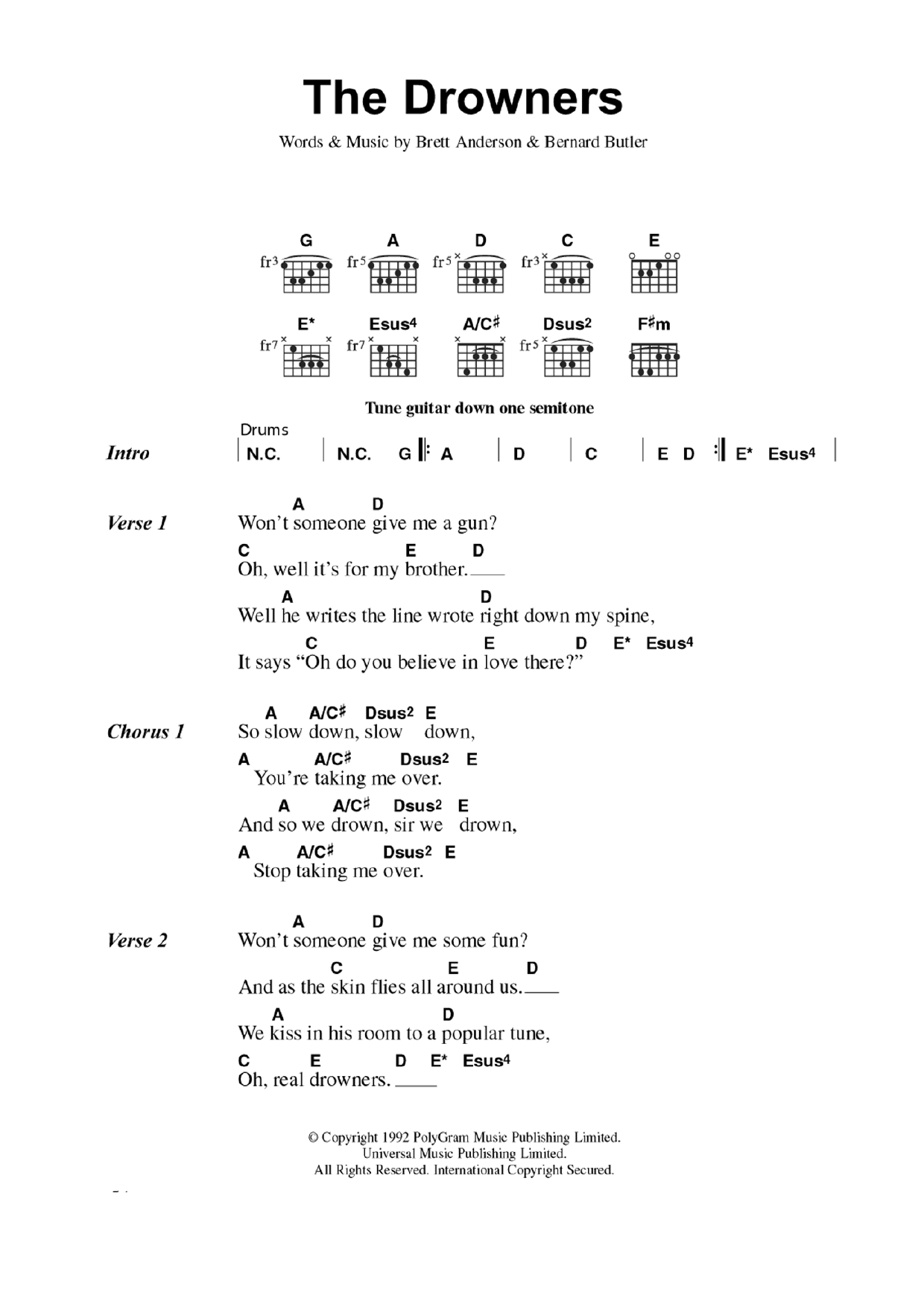 Download or print Suede The Drowners sheet music, chords and digital score arranged for Guitar Chords/Lyrics. This Rock score includes 2 page(s).