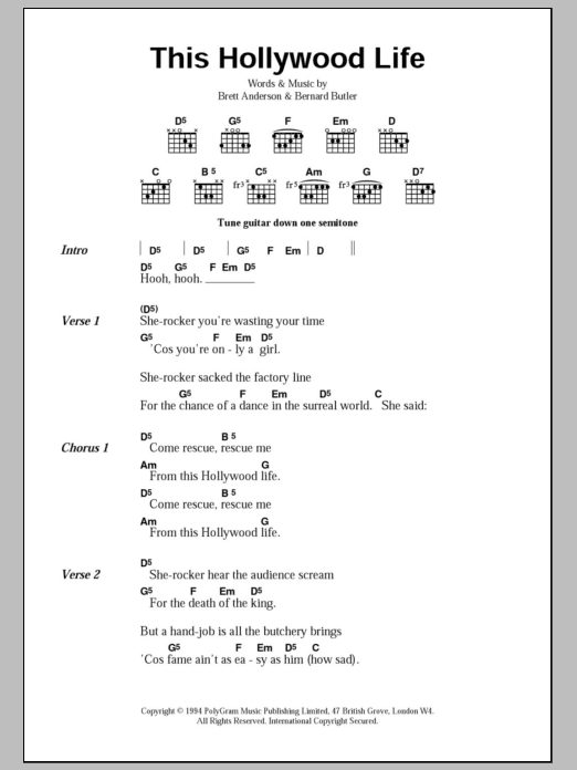 Download or print Suede This Hollywood Life sheet music, chords and digital score arranged for Guitar Chords/Lyrics. This Rock score includes 2 page(s).