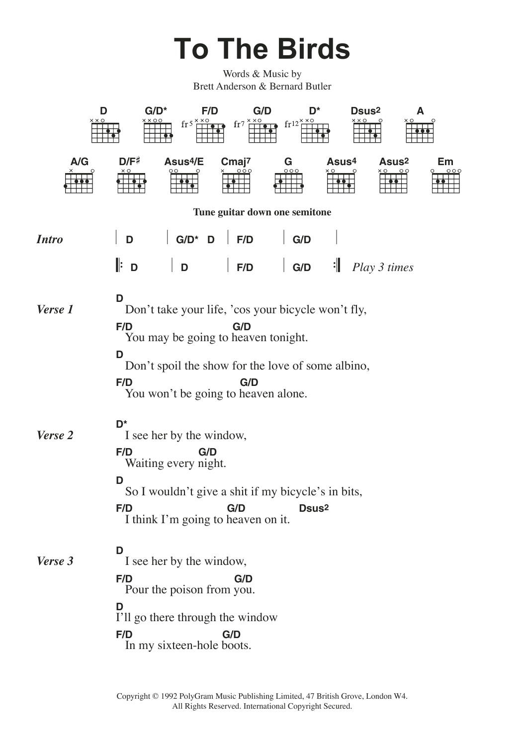 Download or print Suede To The Birds sheet music, chords and digital score arranged for Guitar Chords/Lyrics. This Rock score includes 2 page(s).