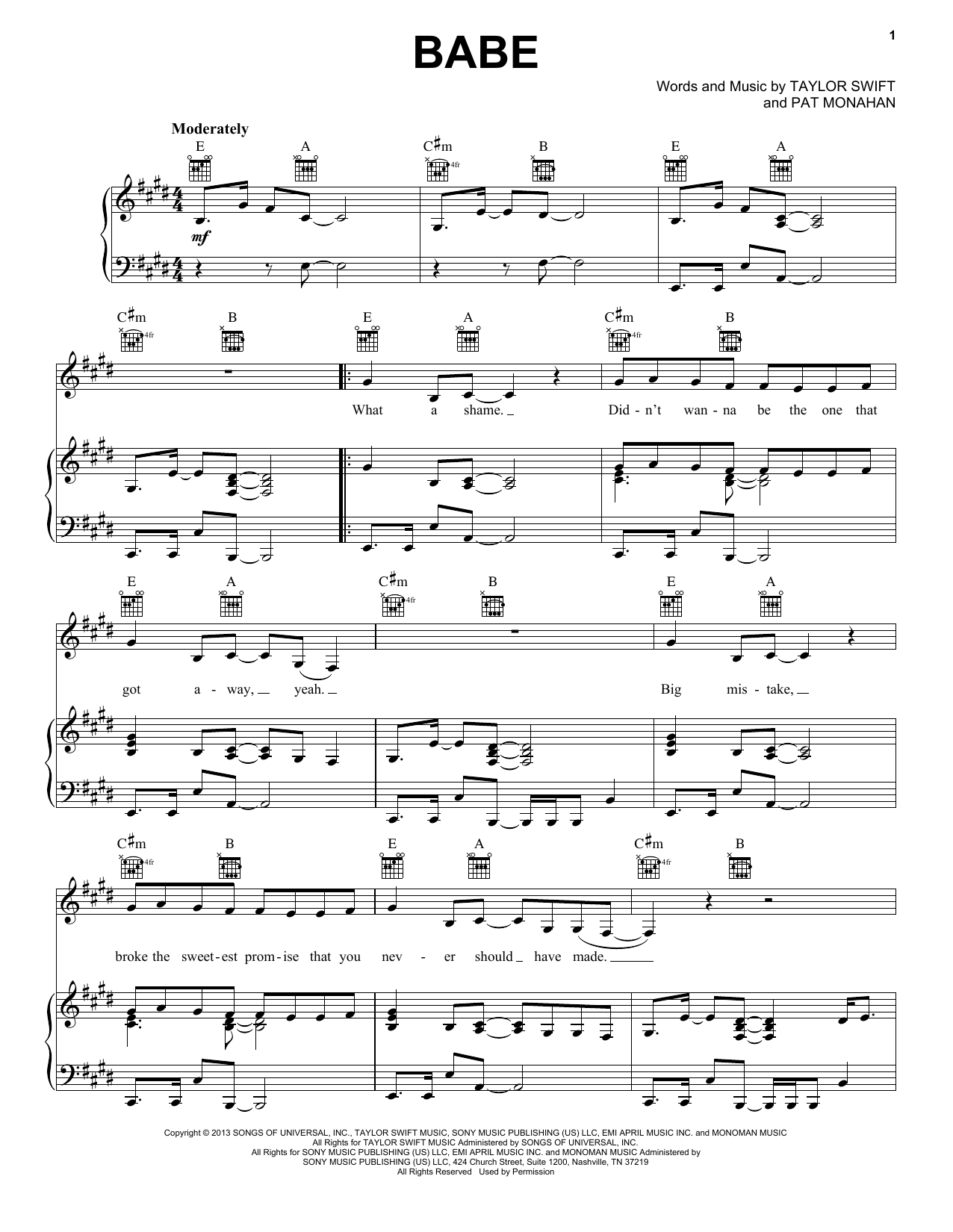 Download or print Sugarland feat. Taylor Swift Babe sheet music, chords and digital score arranged for Piano, Vocal & Guitar Chords (Right-Hand Melody). This Pop score includes 7 page(s).