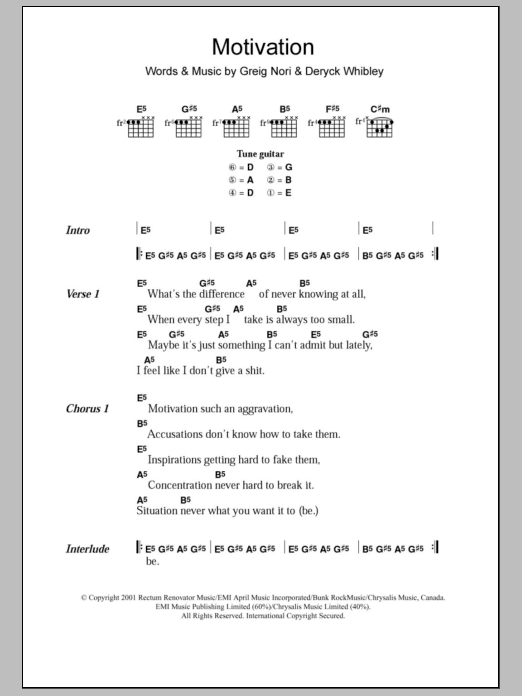 Download or print Sum 41 Motivation sheet music, chords and digital score arranged for Guitar Chords/Lyrics. This Rock score includes 3 page(s).