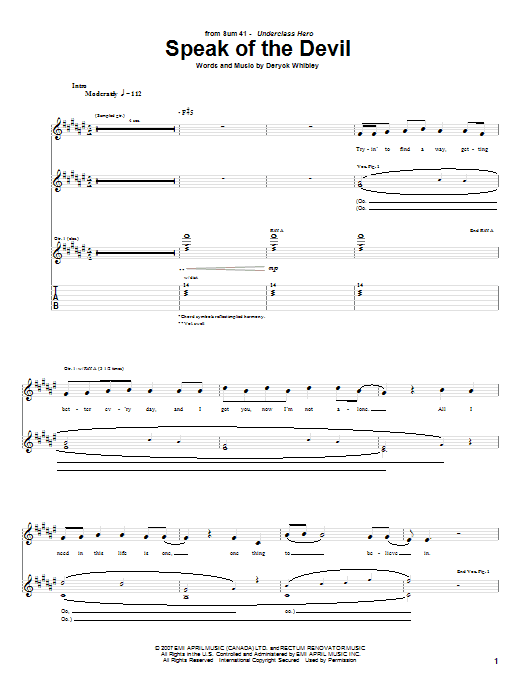 Download or print Sum 41 Speak Of The Devil sheet music, chords and digital score arranged for Guitar Tab. This Pop score includes 7 page(s).