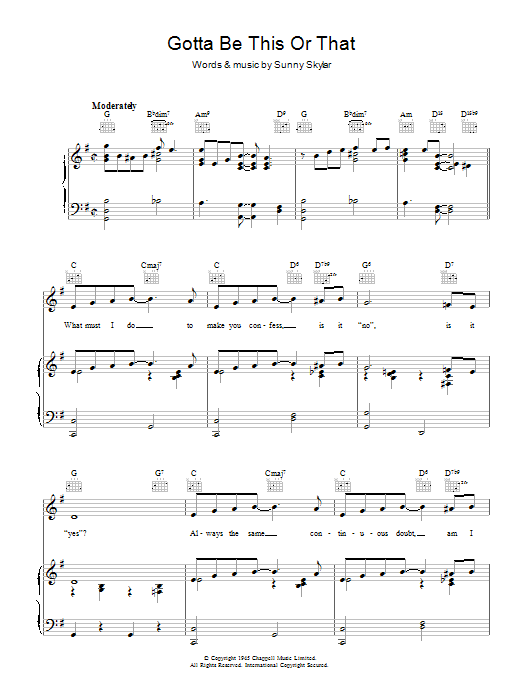 Download or print Sunny Skylar Gotta Be This Or That sheet music, chords and digital score arranged for Piano, Vocal & Guitar Chords. This Standards score includes 5 page(s).