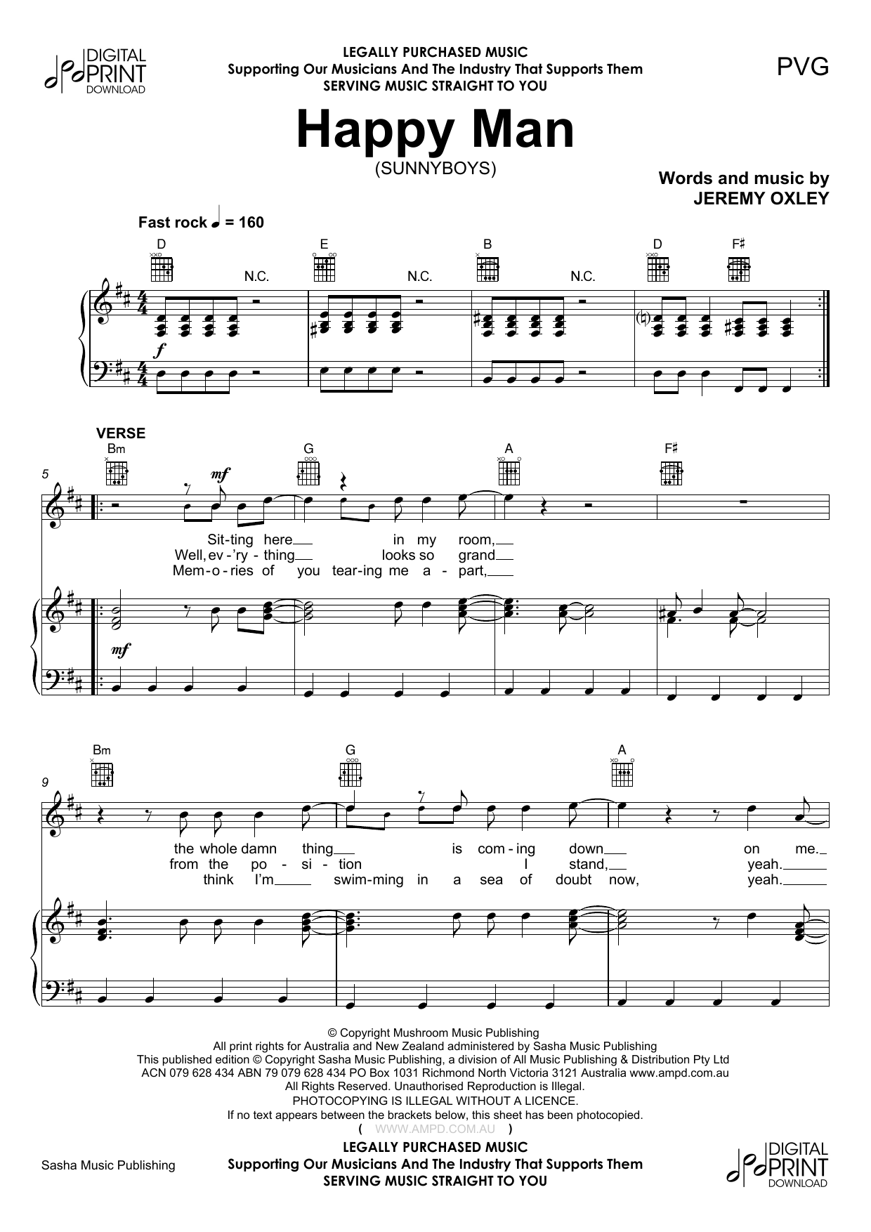 Download or print Sunnyboys Happy Man sheet music, chords and digital score arranged for Piano, Vocal & Guitar Chords (Right-Hand Melody). This Pop score includes 4 page(s).