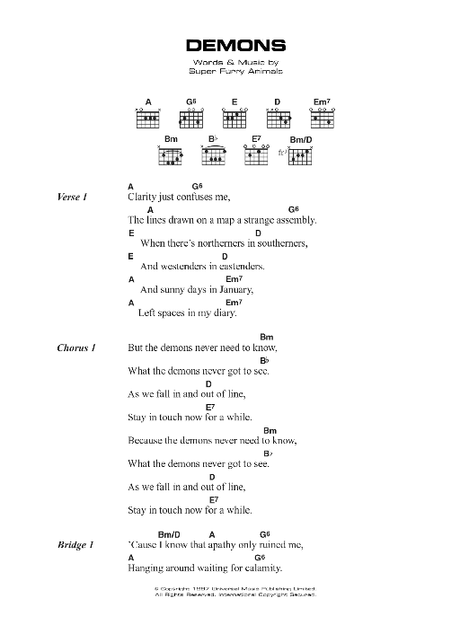 Download or print Super Furry Animals Demons sheet music, chords and digital score arranged for Guitar Chords/Lyrics. This Rock score includes 3 page(s).