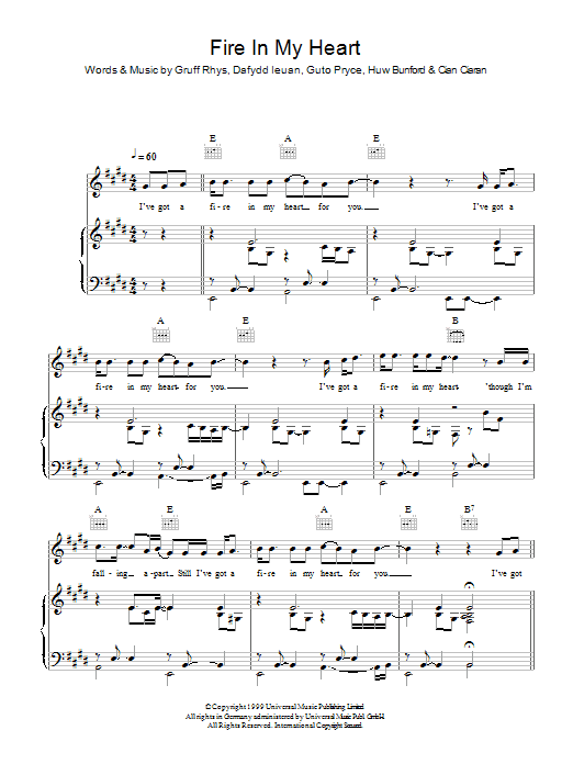 Download or print Super Furry Animals Fire In My Heart sheet music, chords and digital score arranged for Guitar Chords/Lyrics. This Rock score includes 2 page(s).