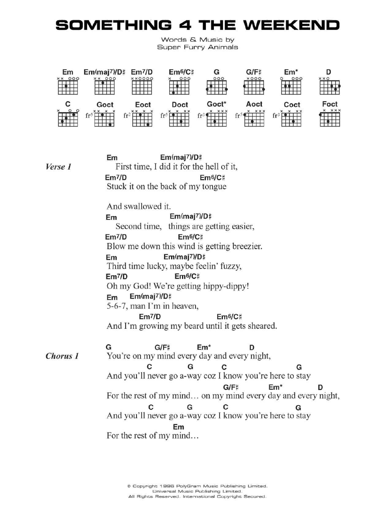 Download or print Super Furry Animals Something 4 The Weekend sheet music, chords and digital score arranged for Guitar Chords/Lyrics. This Rock score includes 2 page(s).