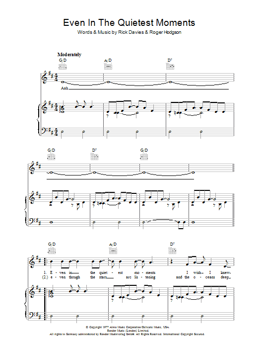 Download or print Supertramp Even In The Quietest Moments sheet music, chords and digital score arranged for Guitar Tab. This Pop score includes 6 page(s).