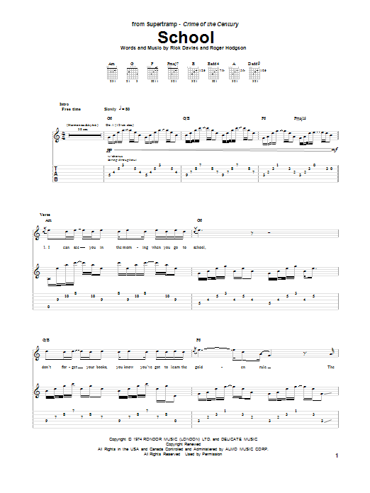 Download or print Supertramp School sheet music, chords and digital score arranged for Guitar Tab. This Pop score includes 13 page(s).
