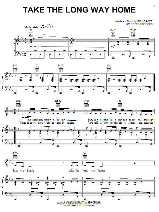 Download or print Supertramp Take The Long Way Home sheet music, chords and digital score arranged for Piano, Vocal & Guitar Chords. This Pop score includes 6 page(s).