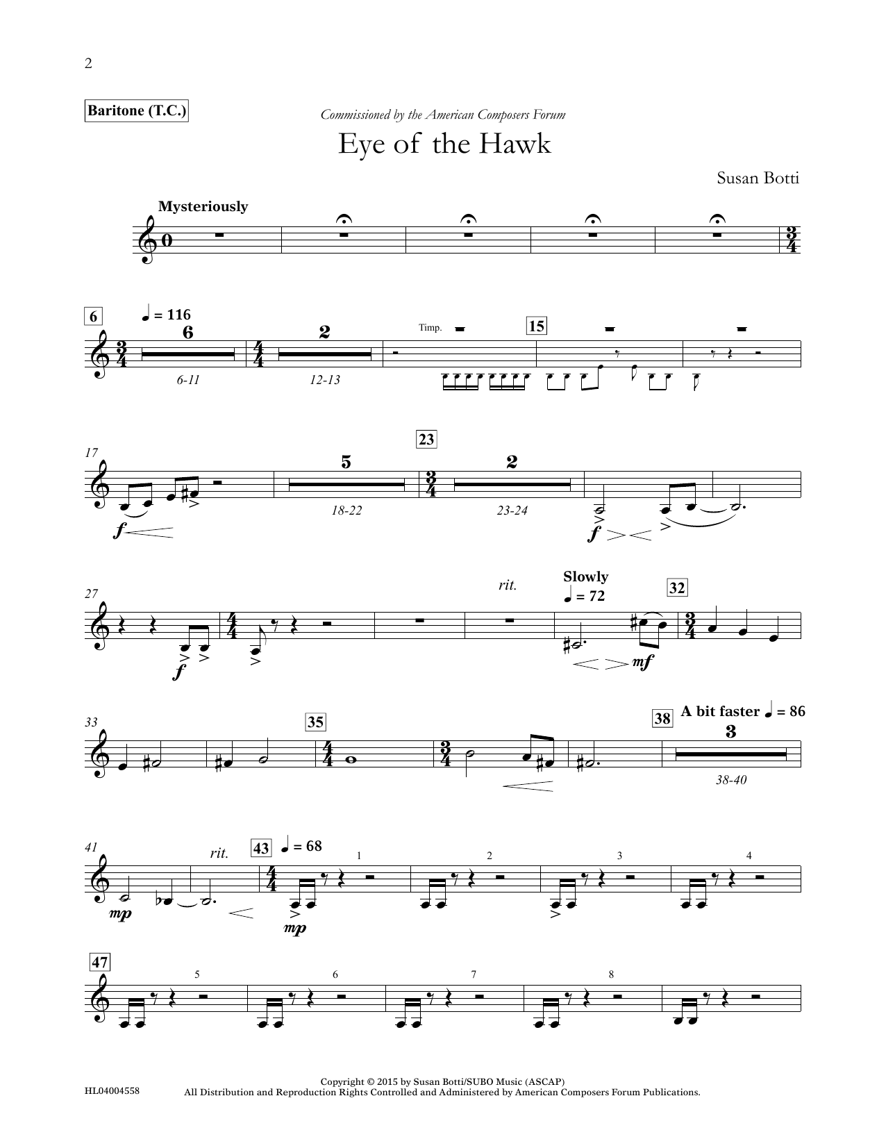 Download or print Susan Botti Eye of the Hawk - Baritone T.C. sheet music, chords and digital score arranged for Concert Band. This Concert score includes 2 page(s).