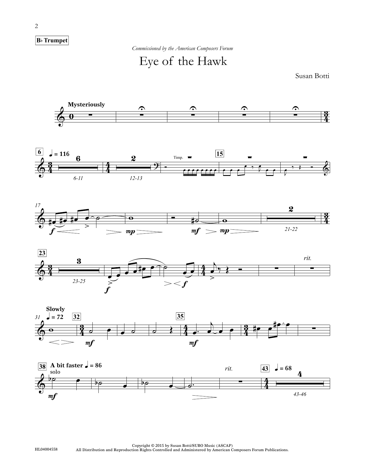 Download or print Susan Botti Eye of the Hawk - Bb Trumpet sheet music, chords and digital score arranged for Concert Band. This Concert score includes 2 page(s).