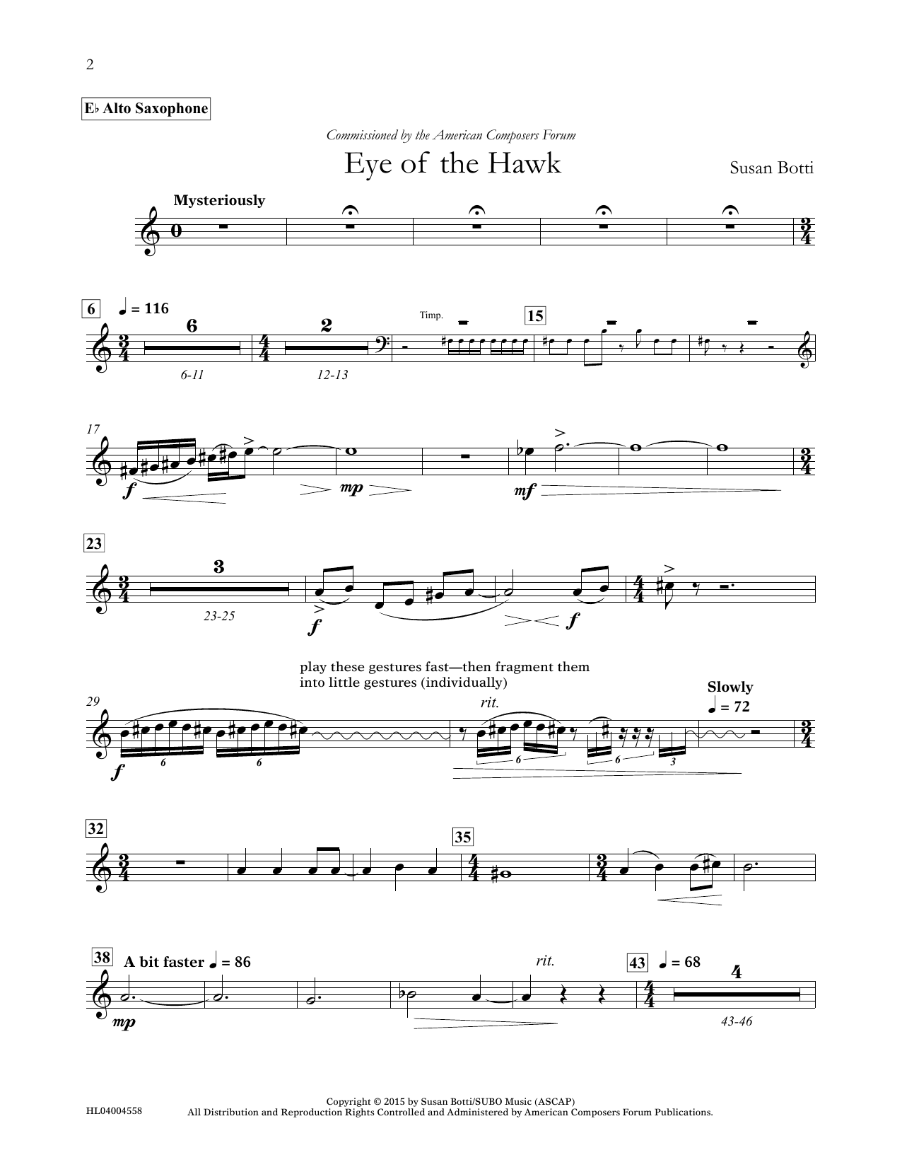 Download or print Susan Botti Eye of the Hawk - Eb Alto Saxophone sheet music, chords and digital score arranged for Concert Band. This Concert score includes 2 page(s).