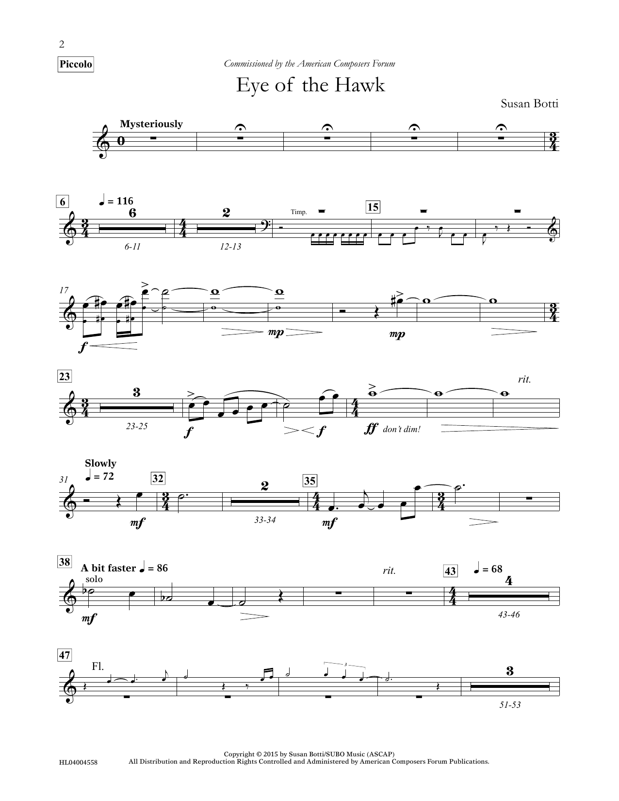 Download or print Susan Botti Eye of the Hawk - Piccolo sheet music, chords and digital score arranged for Concert Band. This Concert score includes 2 page(s).