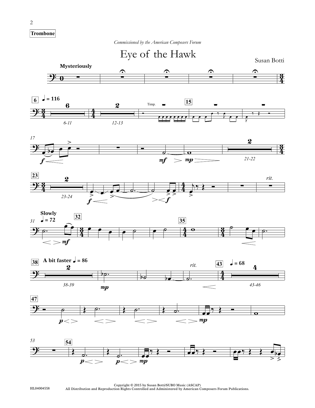 Download or print Susan Botti Eye of the Hawk - Trombone sheet music, chords and digital score arranged for Concert Band. This Concert score includes 2 page(s).