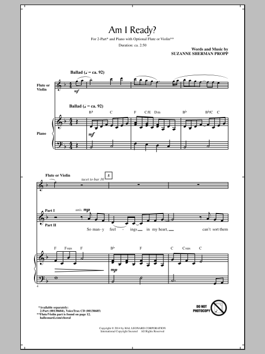 Download or print Suzanne Sherman Propp Am I Ready? sheet music, chords and digital score arranged for 2-Part Choir. This Concert score includes 2 page(s).