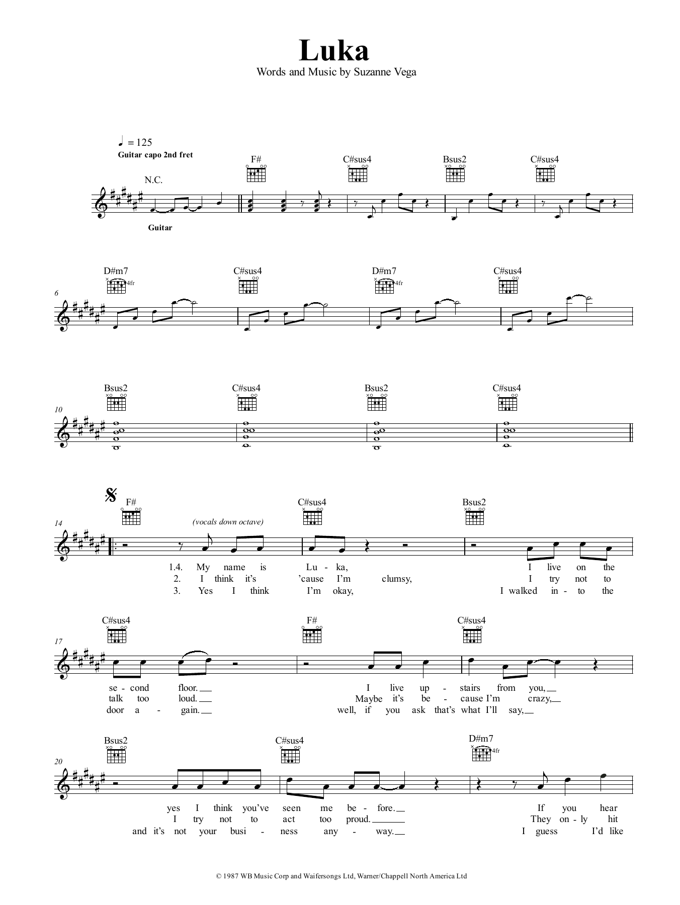 Download or print Suzanne Vega Luka sheet music, chords and digital score arranged for Guitar Chords/Lyrics. This Country score includes 3 page(s).
