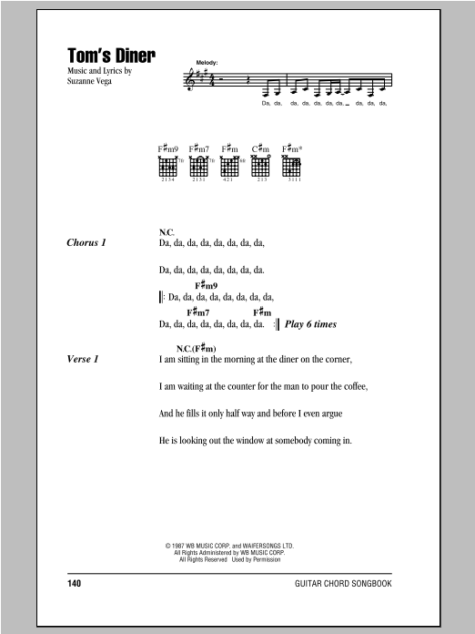 Download or print Suzanne Vega Tom's Diner sheet music, chords and digital score arranged for Guitar Chords/Lyrics. This Rock score includes 3 page(s).