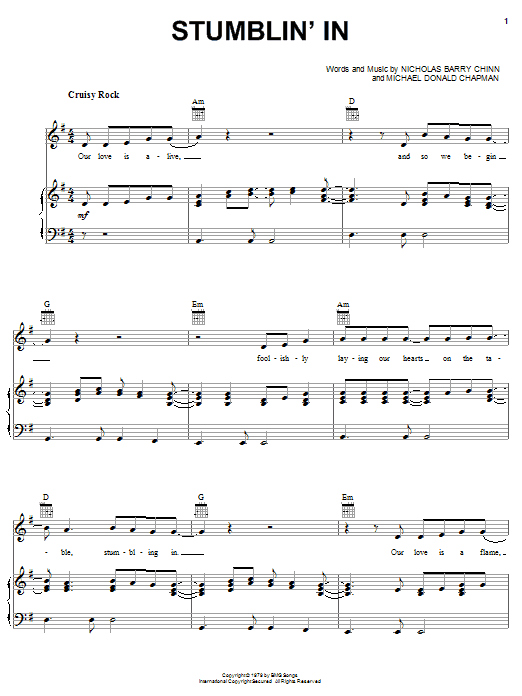 Download or print Suzi Quatro Stumblin' In sheet music, chords and digital score arranged for Piano, Vocal & Guitar Chords (Right-Hand Melody). This Pop score includes 7 page(s).