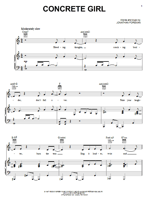 Download or print Switchfoot Concrete Girl sheet music, chords and digital score arranged for Piano, Vocal & Guitar Chords (Right-Hand Melody). This Christian score includes 8 page(s).