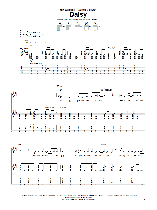 Download or print Switchfoot Daisy sheet music, chords and digital score arranged for Guitar Tab. This Christian score includes 9 page(s).