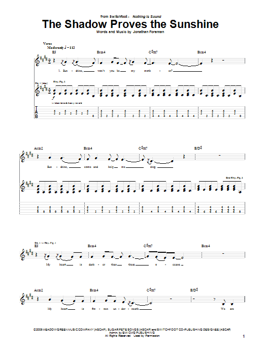 Download or print Switchfoot The Shadow Proves The Sunshine sheet music, chords and digital score arranged for Piano, Vocal & Guitar Chords (Right-Hand Melody). This Christian score includes 6 page(s).