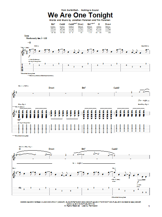 Download or print Switchfoot We Are One Tonight sheet music, chords and digital score arranged for Guitar Tab. This Christian score includes 11 page(s).