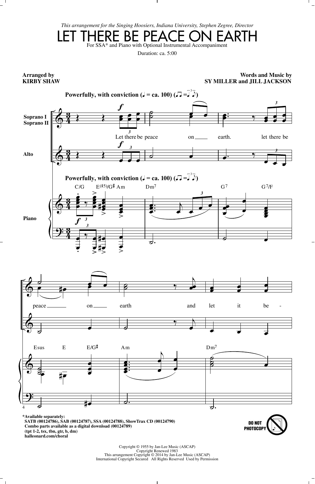 Download or print Sy Miller and Jill Jackson Let There Be Peace On Earth (arr. Kirby Shaw) sheet music, chords and digital score arranged for SSA Choir. This Patriotic score includes 15 page(s).