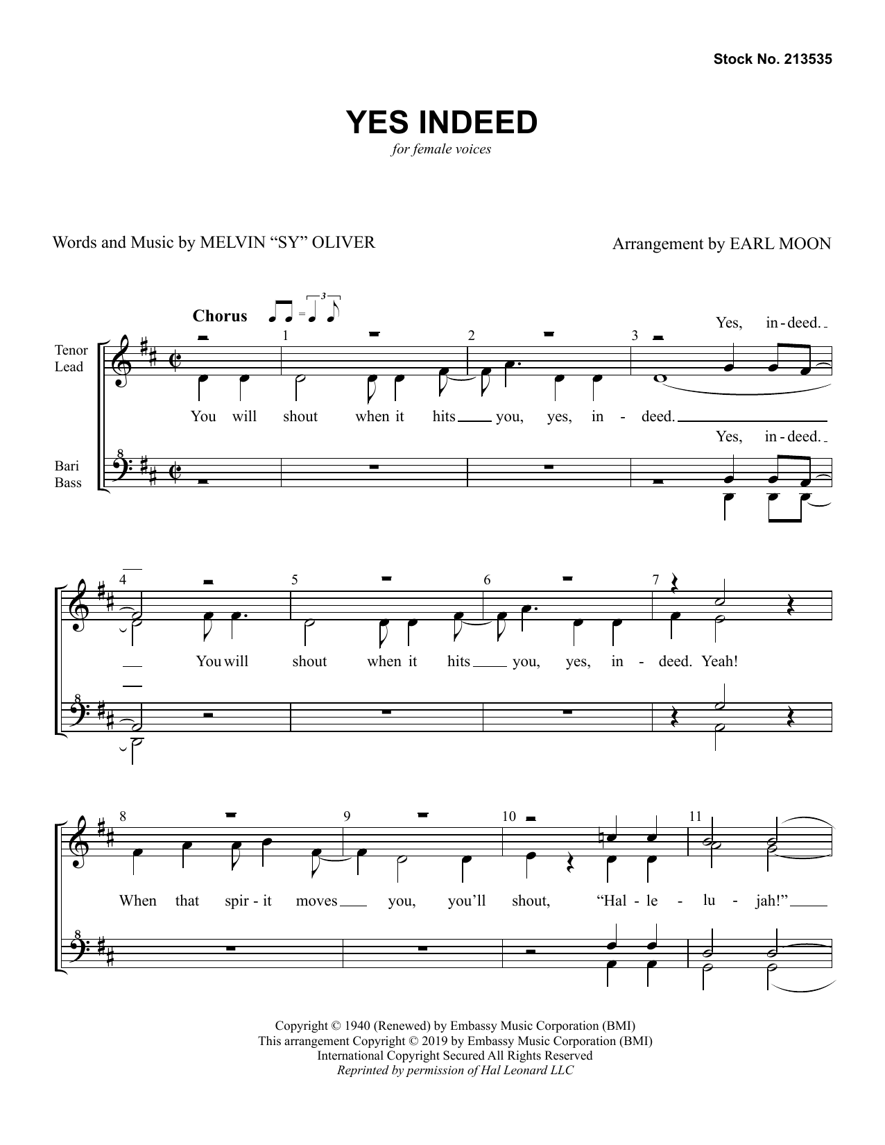 Download or print Sy Oliver Yes Indeed (arr. Earl Moon) sheet music, chords and digital score arranged for SSAA Choir. This Country score includes 8 page(s).
