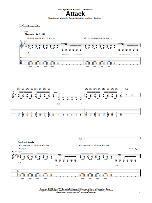 Download or print System Of A Down Attack sheet music, chords and digital score arranged for Guitar Tab. This Metal score includes 9 page(s).