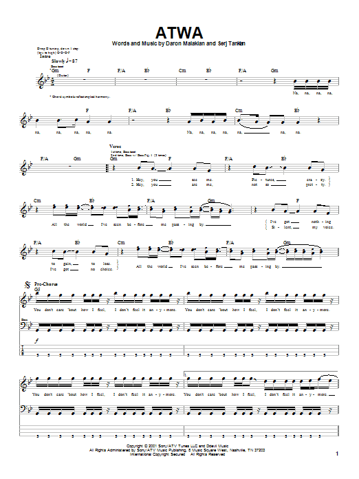 Download or print System Of A Down ATWA sheet music, chords and digital score arranged for Bass Guitar Tab. This Metal score includes 3 page(s).