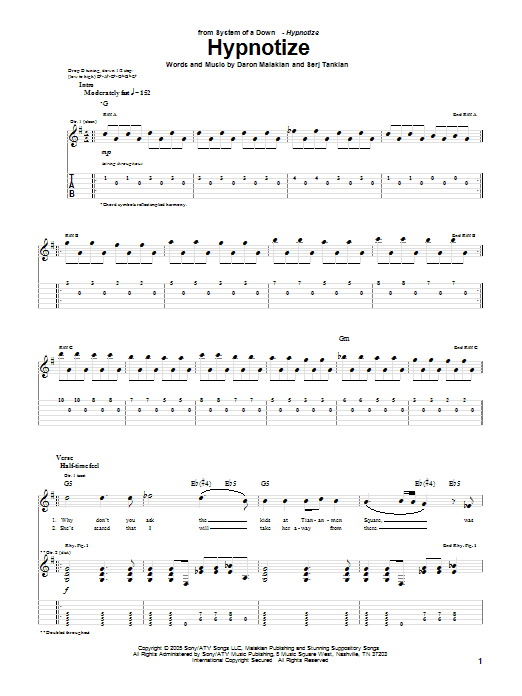 Download or print System Of A Down Hypnotize sheet music, chords and digital score arranged for Guitar Tab. This Metal score includes 6 page(s).