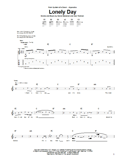 Download or print System Of A Down Lonely Day sheet music, chords and digital score arranged for Guitar Tab. This Metal score includes 8 page(s).