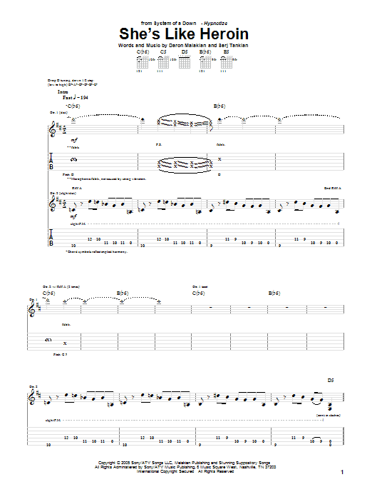 Download or print System Of A Down She's Like Heroin sheet music, chords and digital score arranged for Guitar Tab. This Metal score includes 7 page(s).