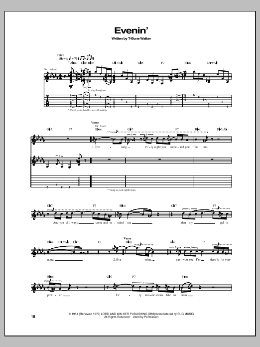Download or print T-Bone Walker Evenin' sheet music, chords and digital score arranged for Guitar Tab. This Blues score includes 3 page(s).