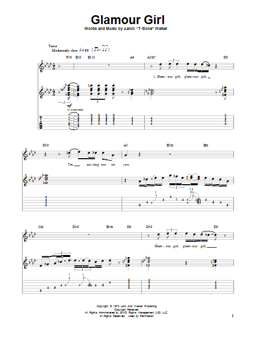 Download or print T-Bone Walker Glamour Girl sheet music, chords and digital score arranged for Guitar Tab (Single Guitar). This Blues score includes 5 page(s).