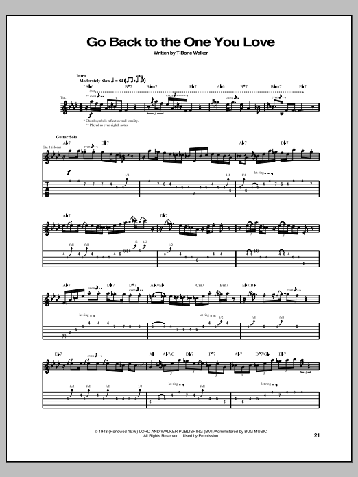 Download or print T-Bone Walker Go Back To The One You Love sheet music, chords and digital score arranged for Guitar Tab. This Blues score includes 4 page(s).