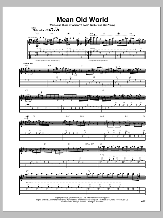 Download or print T-Bone Walker Mean Old World sheet music, chords and digital score arranged for Guitar Tab. This Blues score includes 5 page(s).