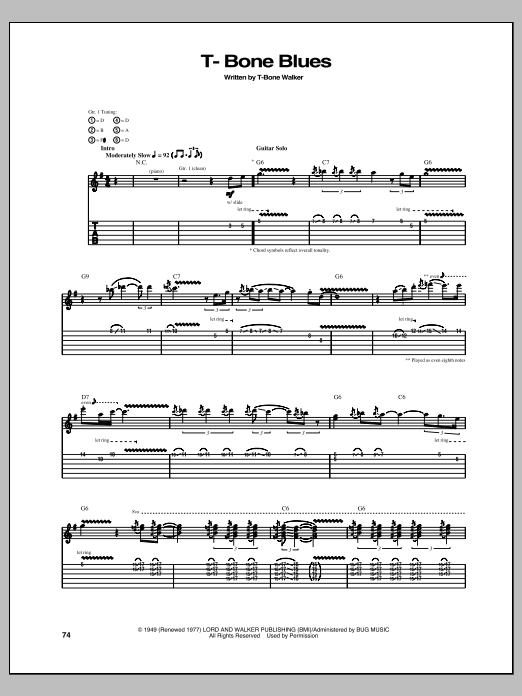 Download or print T-Bone Walker T-Bone Blues sheet music, chords and digital score arranged for Guitar Tab. This Blues score includes 4 page(s).