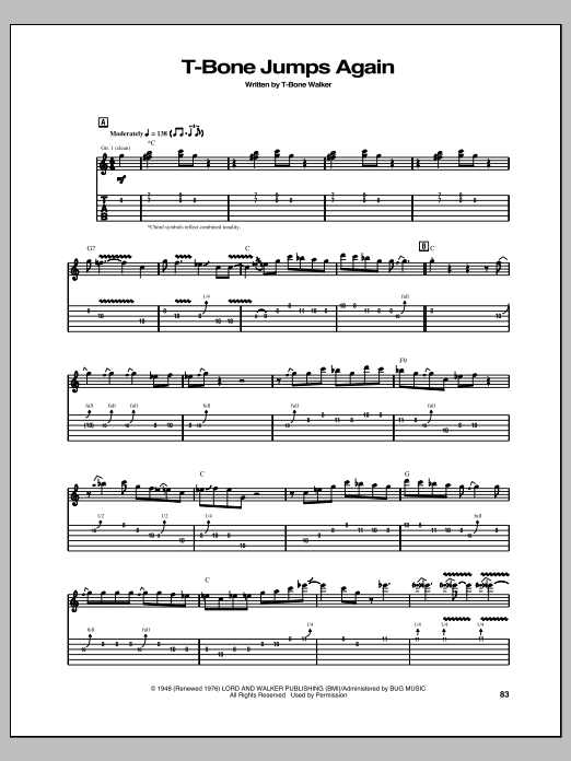 Download or print T-Bone Walker T-Bone Jumps Again sheet music, chords and digital score arranged for Guitar Tab (Single Guitar). This Blues score includes 5 page(s).