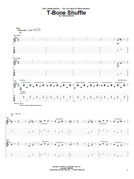 Download or print T-Bone Walker T-Bone Shuffle sheet music, chords and digital score arranged for Guitar Tab. This Blues score includes 5 page(s).